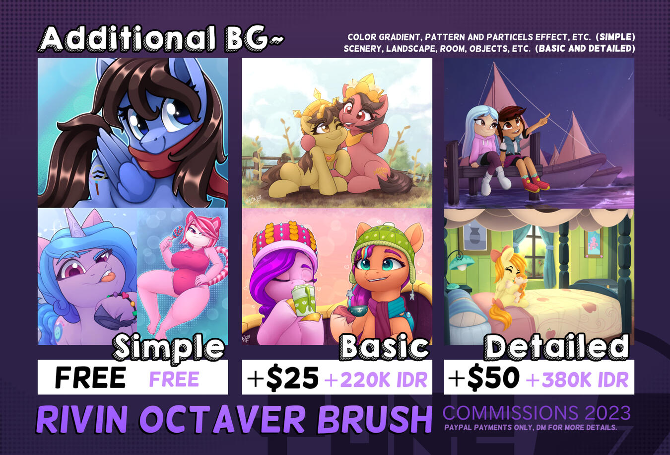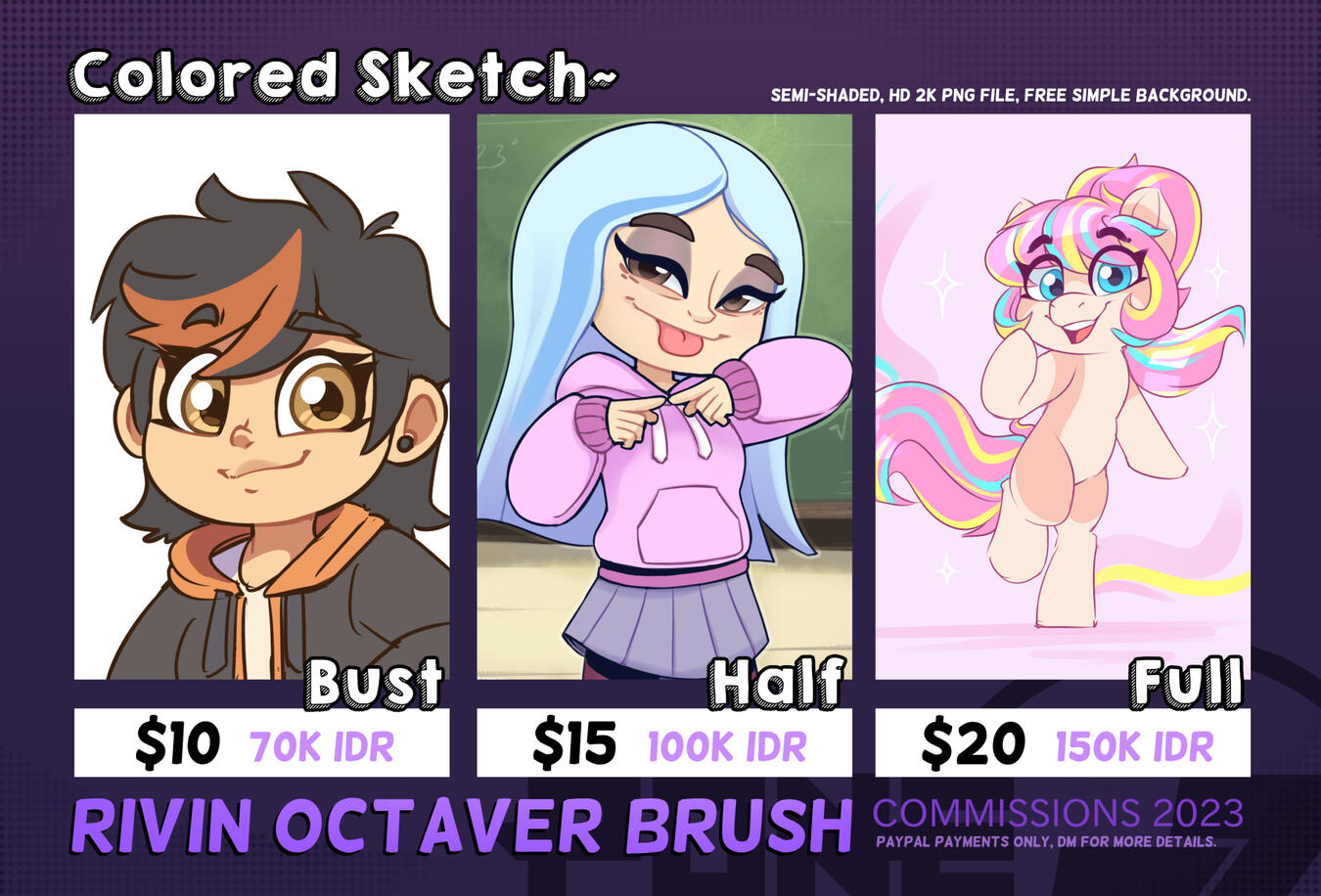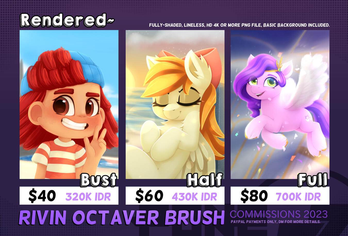 - Commissions will usually take up to 3 weeks or more, it depends on the complexity of the illustration and queues of others.- Proper reference is needed for any character that I have to draw, so it would be easier for me.- The payment has to be done through PayPal either with an invoice or none, and Customers have to provide their email first.- Every PayPal transaction has a fee, so it will slightly increase the original price.- Customers can pay before or after the rough sketch is done and approved.- Customers can see every step of their commission progress. usually, you have to ask for it, if don't, I will send the final result of it.- will draw cartoonist artstyle, fanart, humans, chibi, ponies, anthro furry, comics, suggestive NSFW, BG landscapes, etc.- won't draw Anime artstyle, gore, violence, realism, detailed muscle/clothes, etc.