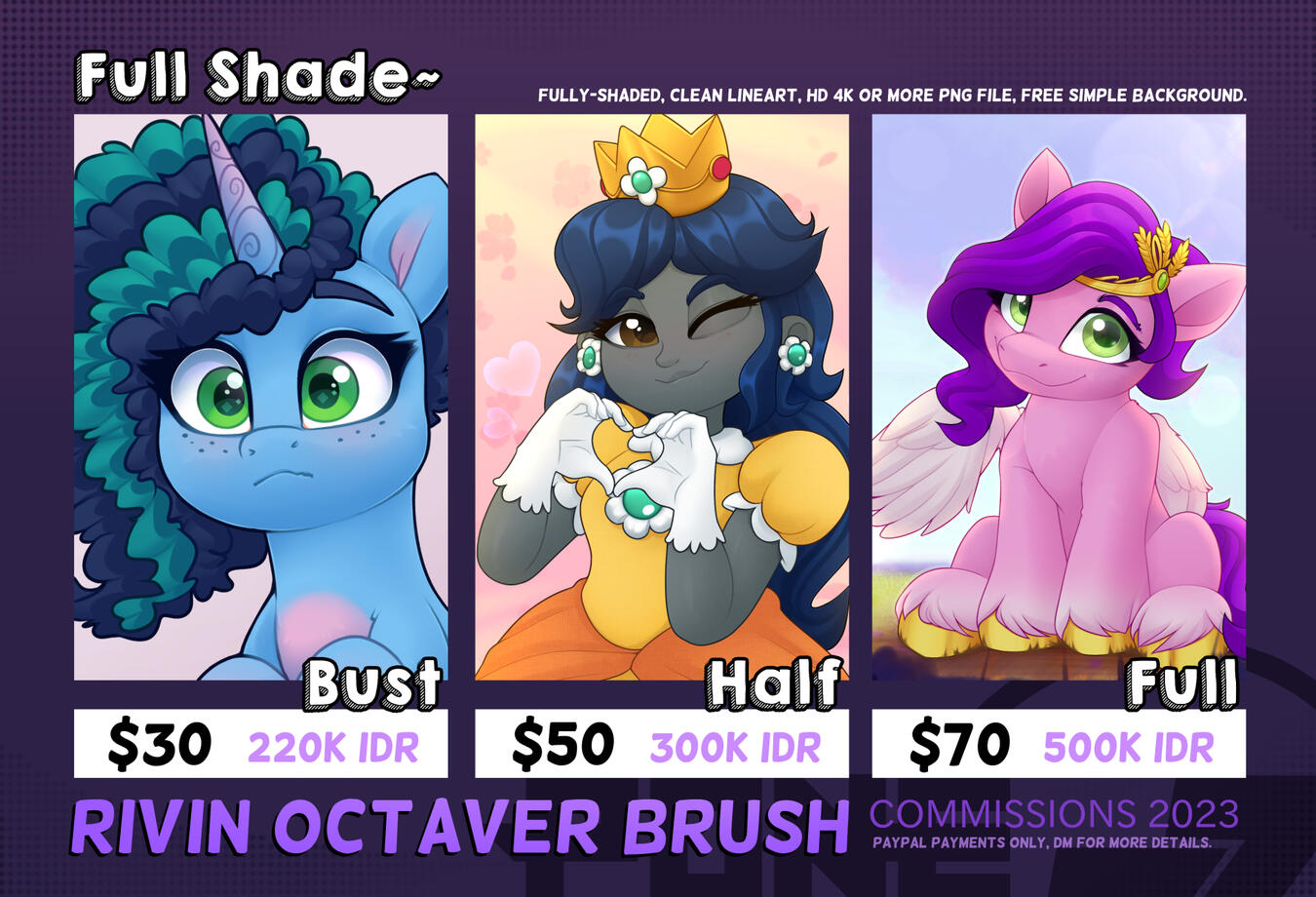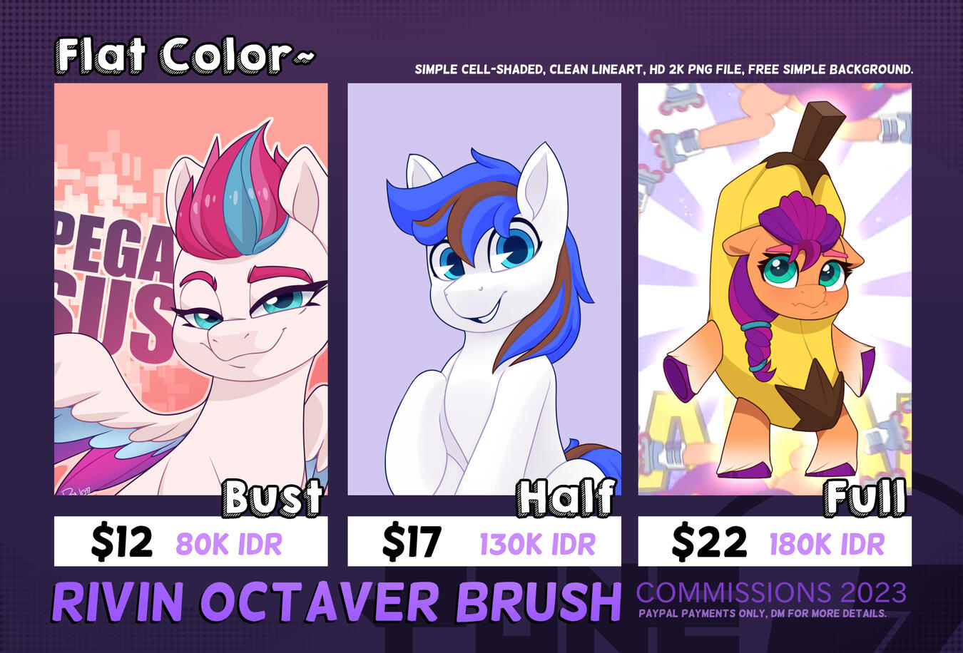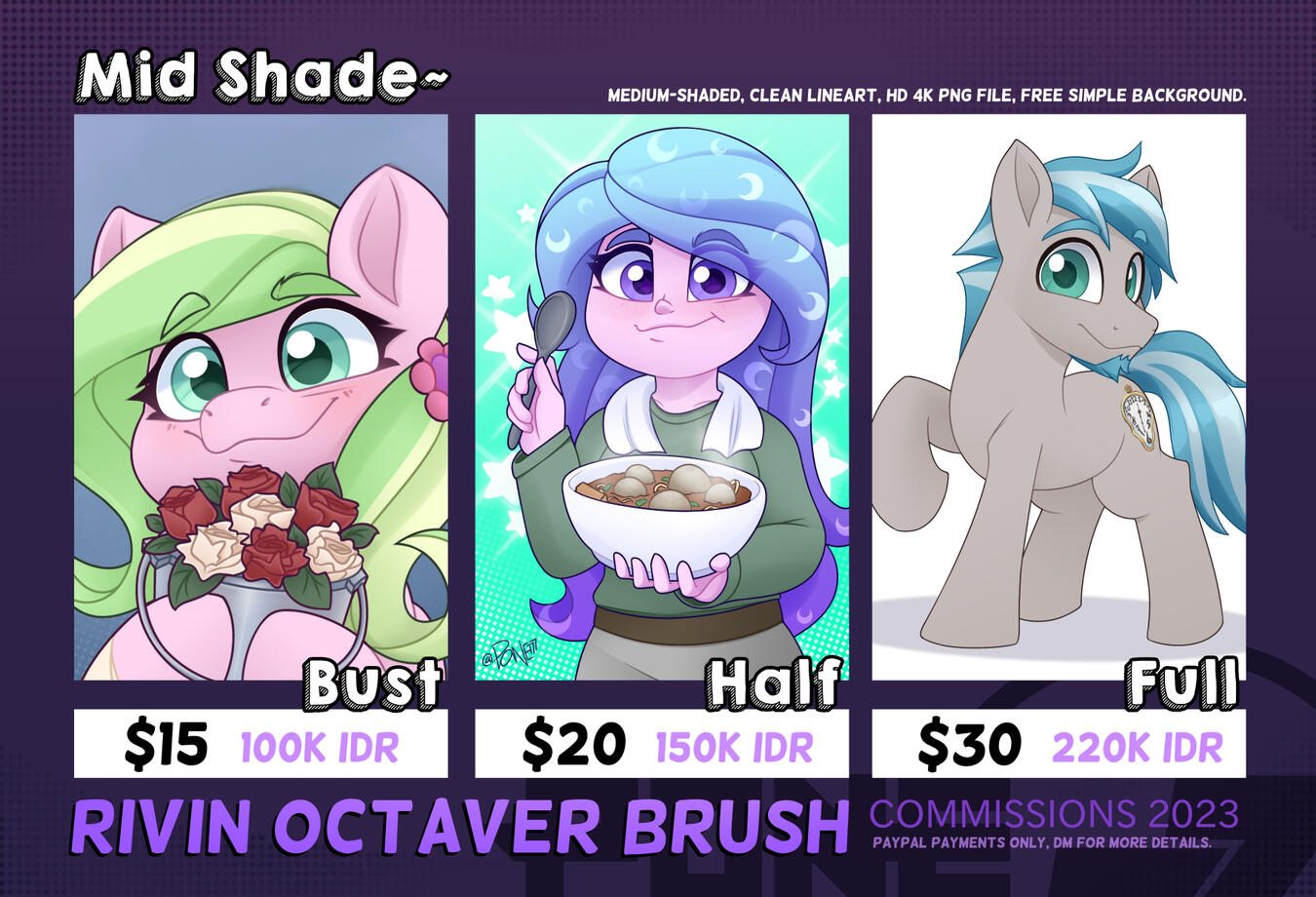 - Commissions will usually take up to 3 weeks or more, it depends on the complexity of the illustration and queues of others.- Proper reference is needed for any character that I have to draw, so it would be easier for me.- The payment has to be done through PayPal either with an invoice or none, and Customers have to provide their email first.- Every PayPal transaction has a fee, so it will slightly increase the original price.- Customers can pay before or after the rough sketch is done and approved.- Customers can see every step of their commission progress. usually, you have to ask for it, if don't, I will send the final result of it.- will draw cartoonist artstyle, fanart, humans, chibi, ponies, anthro furry, comics, suggestive NSFW, BG landscapes, etc.- won't draw Anime artstyle, gore, violence, realism, detailed muscle/clothes, etc.